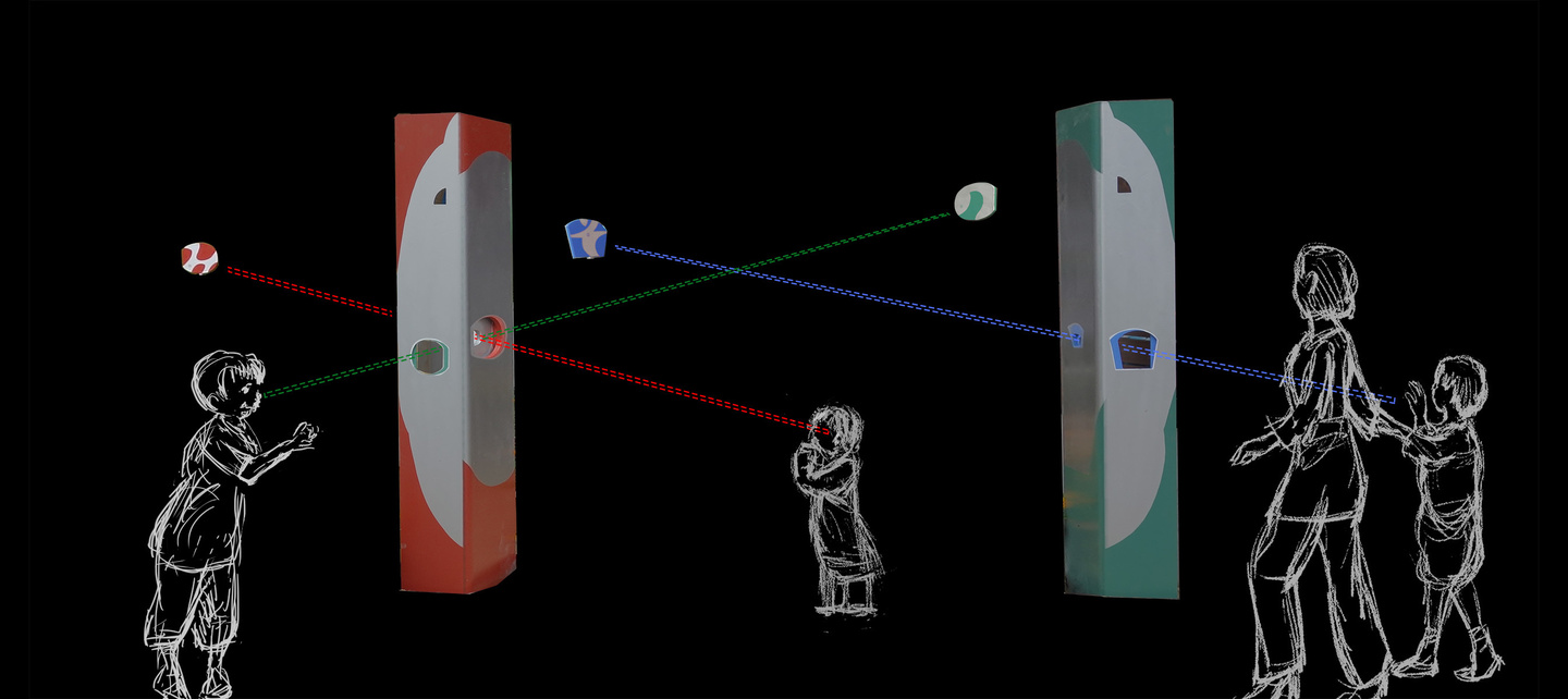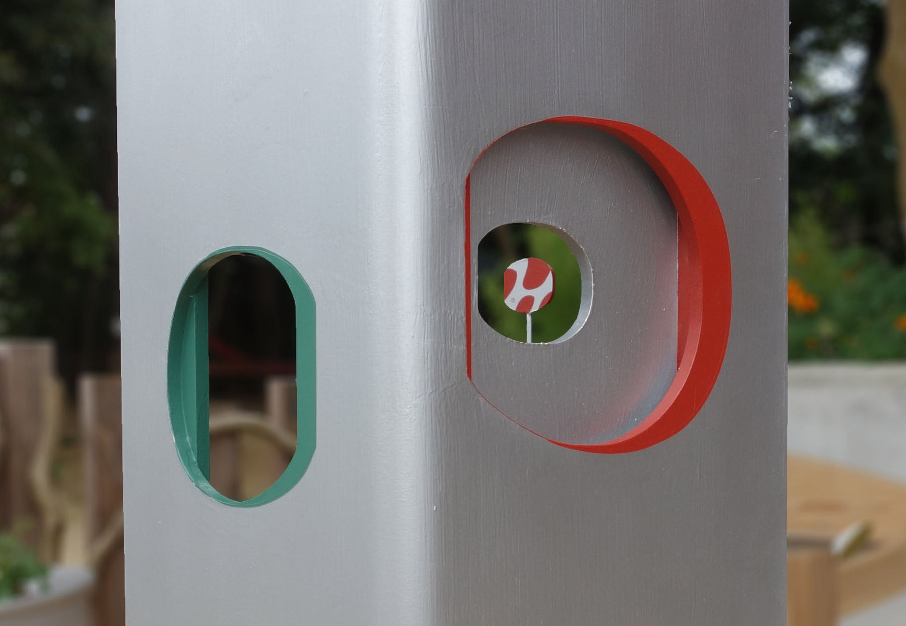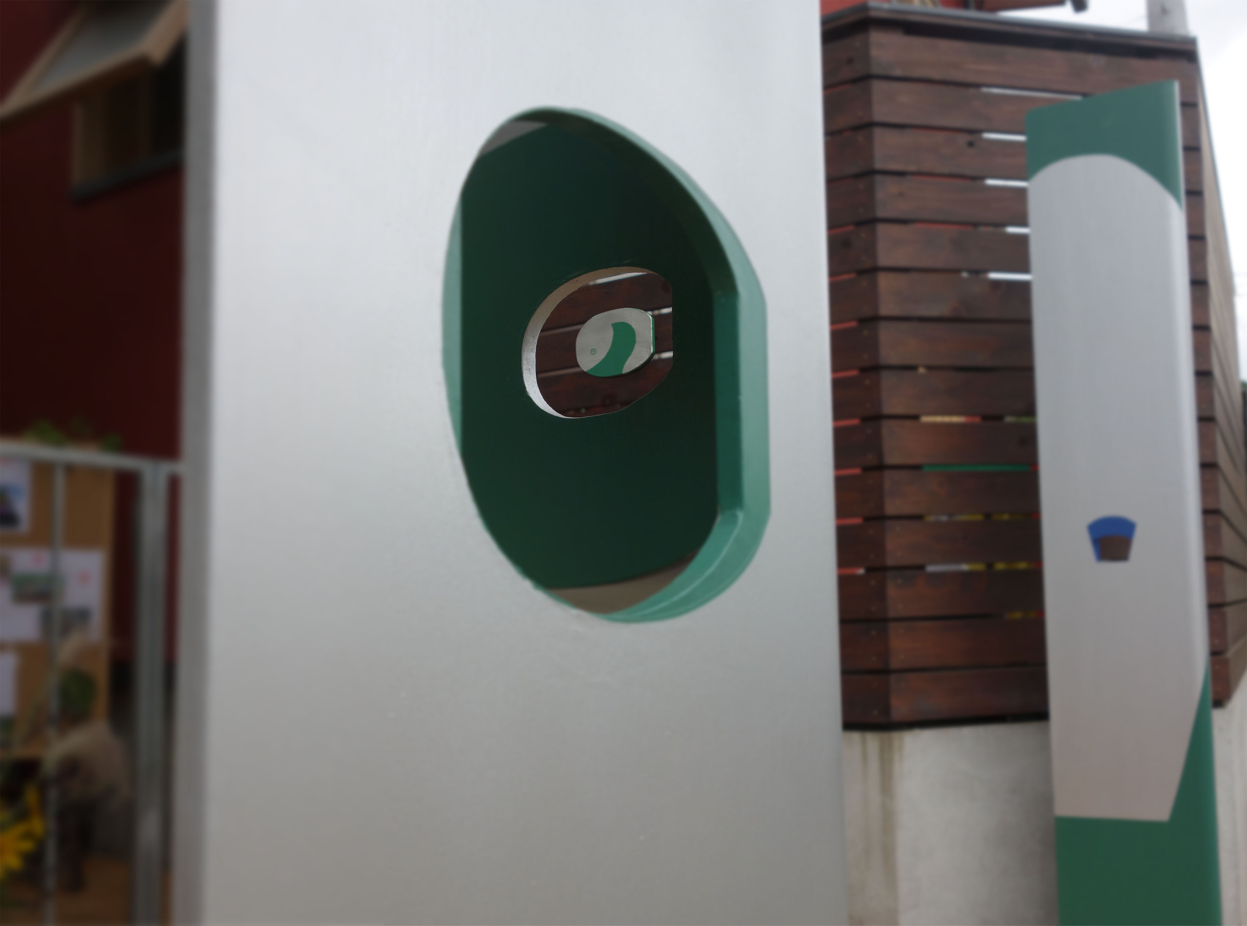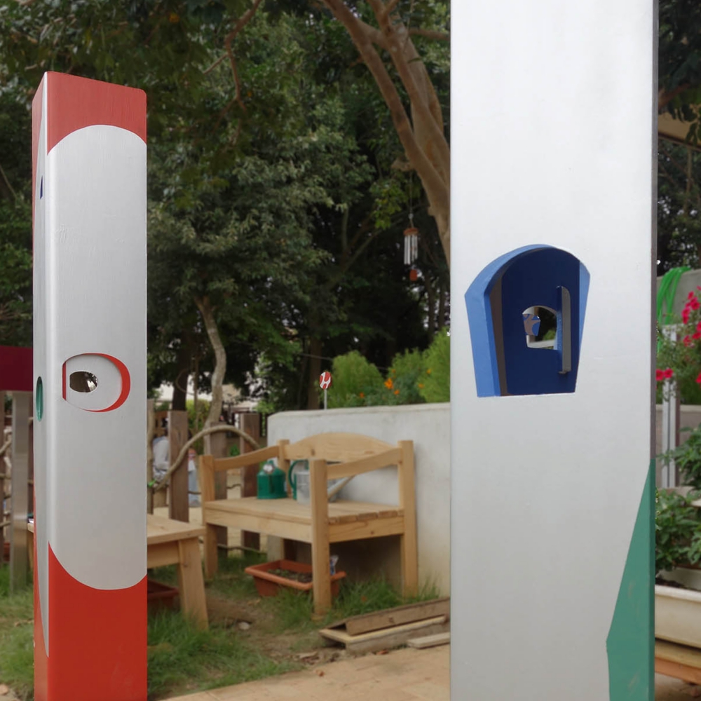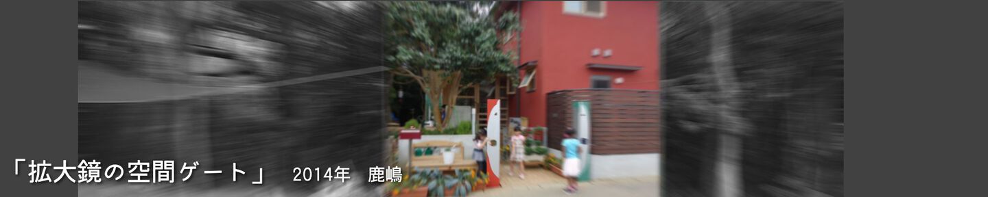 結界 - ミニチュアールの世界へ 保育園の門柱とサインなどによるインターフェイス空間「 拡大鏡の結界 」 大人のスケール感から子供のスケール感へ、空間を変容する門。レンズの様に小さなものが見えてくる世界へと入って行く。 建物の赤と 樹木の緑を 交差させながら広げ、銀色の中には人影の色合いが ほんのりと映る。 子供が「トトロ」を発見した切っ掛けはバケツの穴から覗いたドングリ。焦点が合い、はっきり見えて来る自然界のなかに紛れていたものに妖精が潜むと思うと、森に囲まれた庭は特別な場所になる。 開口から覗くとその向こうに、それぞれ同じ色で 「み」「そ」「の」の文字サインが見える。 『 植物学者の拡大鏡、それはふたたびみいだされた幼年時代である。 それは植物学者に子供の拡大する目をかえす。 』 ガストン・バシュラール「空間の詩学」より