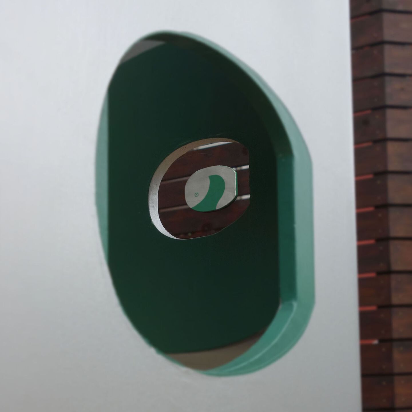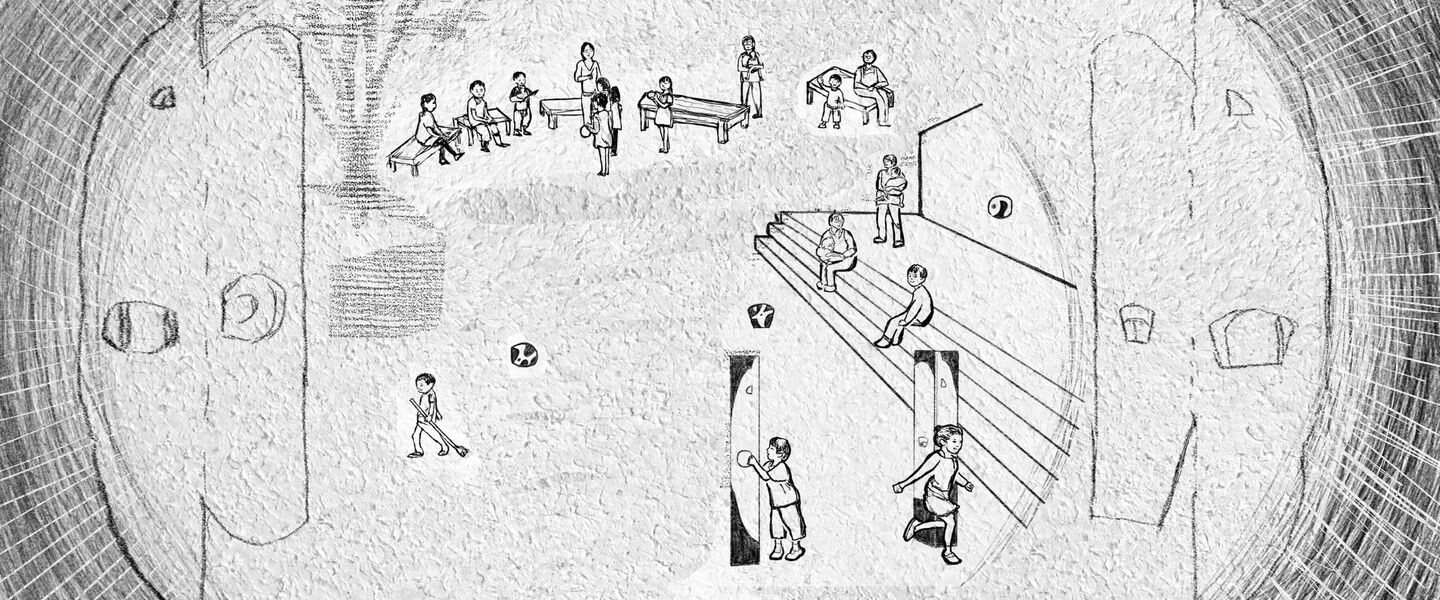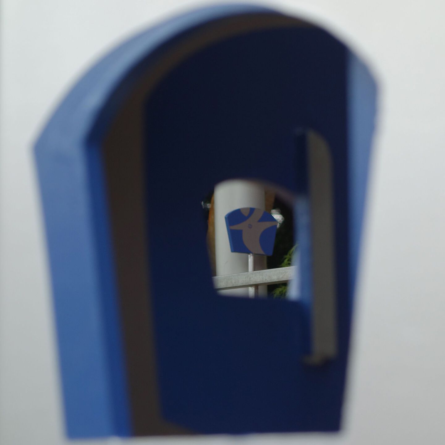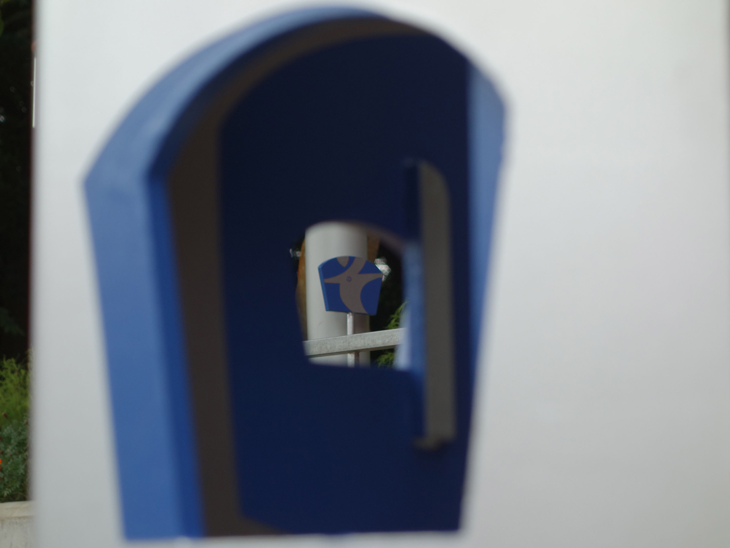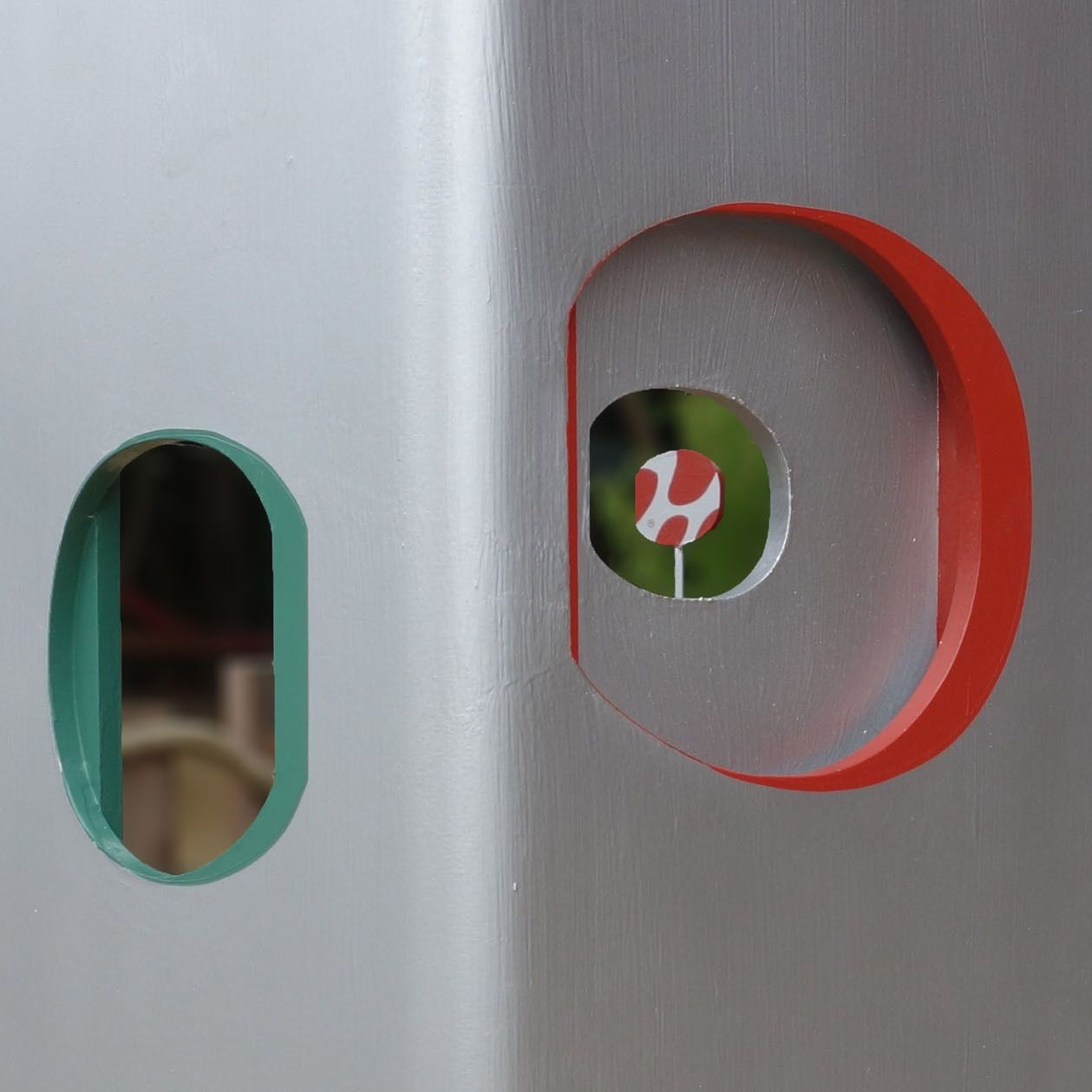 結界 - ミニチュアールの世界へ 保育園の門柱とサインなどによるインターフェイス空間「 拡大鏡の結界 」 大人のスケール感から子供のスケール感へ、空間を変容する門。レンズの様に小さなものが見えてくる世界へと入って行く。 建物の赤と 樹木の緑を 交差させながら広げ、銀色の中には人影の色合いが ほんのりと映る。 子供が「トトロ」を発見した切っ掛けはバケツの穴から覗いたドングリ。焦点が合い、はっきり見えて来る自然界のなかに紛れていたものに妖精が潜むと思うと、森に囲まれた庭は特別な場所になる。 開口から覗くとその向こうに、それぞれ同じ色で 「み」「そ」「の」の文字サインが見える。 『 植物学者の拡大鏡、それはふたたびみいだされた幼年時代である。 それは植物学者に子供の拡大する目をかえす。 』 ガストン・バシュラール「空間の詩学」より