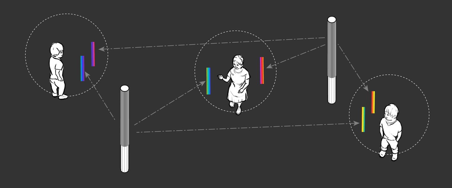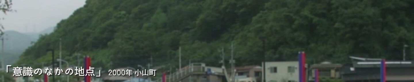 周囲に富士山を始めいくつもの「山」や「峠」が点在している谷間の施設のアプローチ。山は霞みやすくまた手前の丘に邪魔されて見えないときも多い。ここに埋め込まれた地名は、円柱がその配色に見える方向にその地点があることを示している。この広場内を歩き回って、これらの地点がその配色の方向にあることを意識のなかで結びつけながら知覚体験できる。
