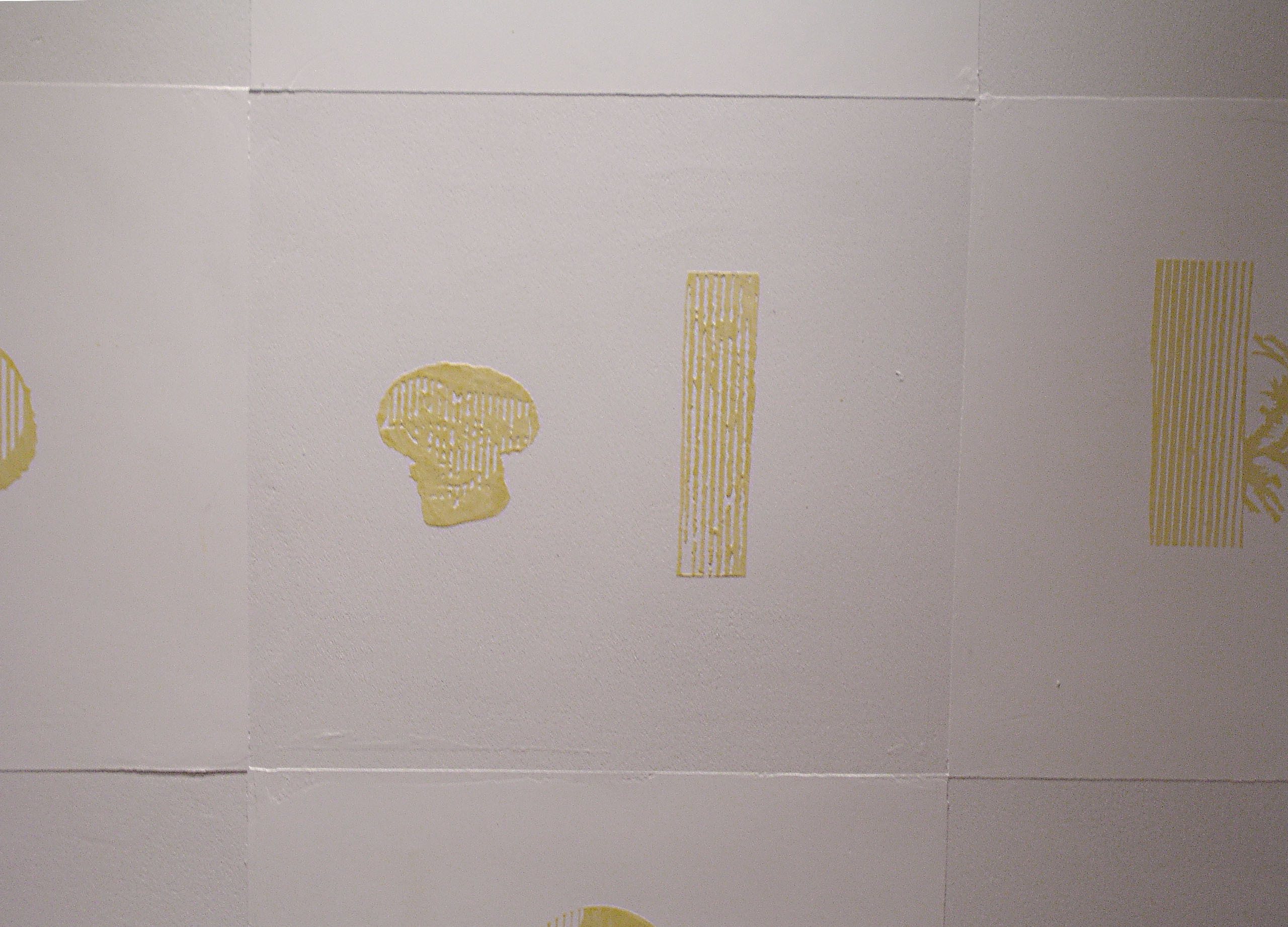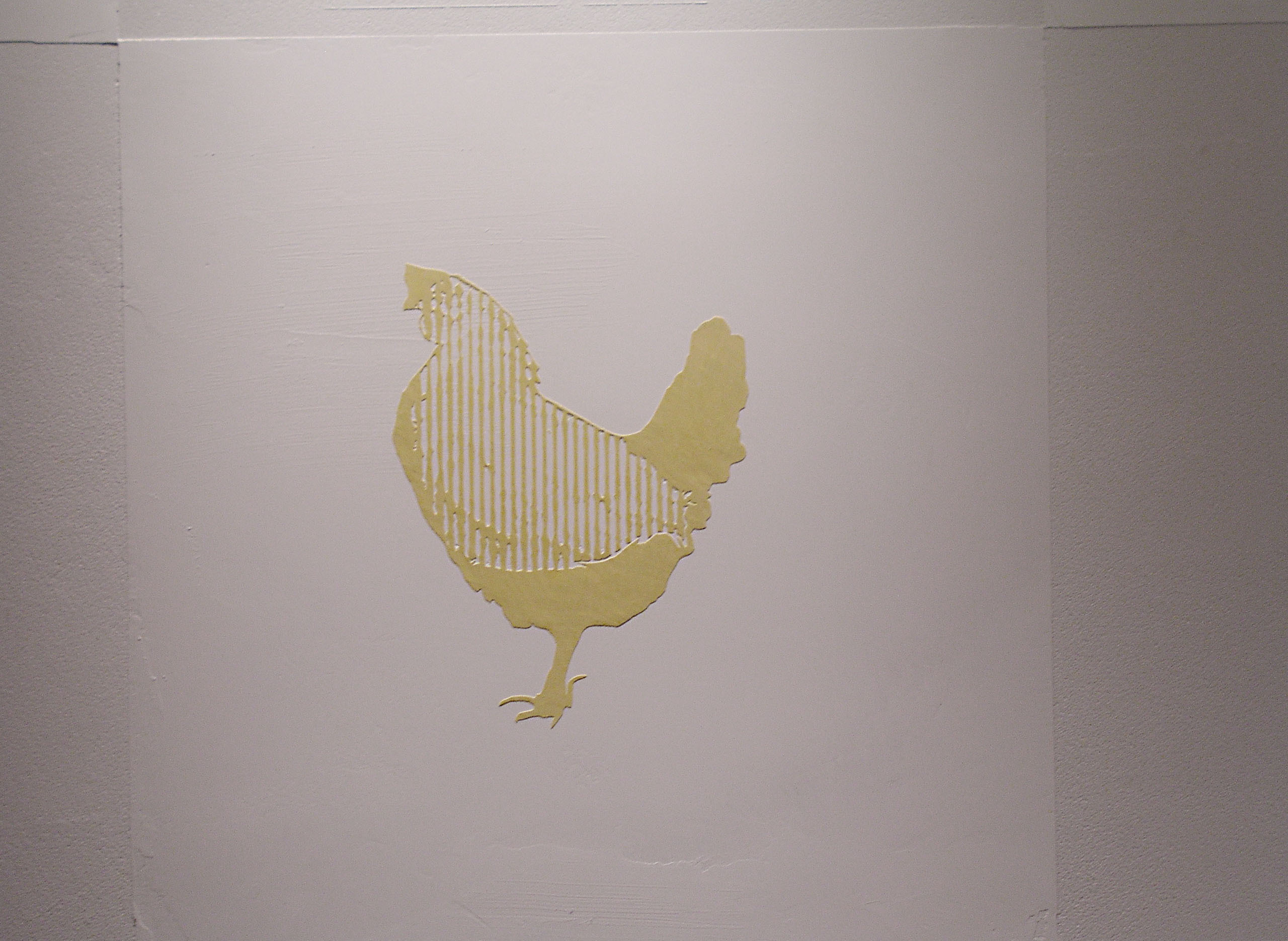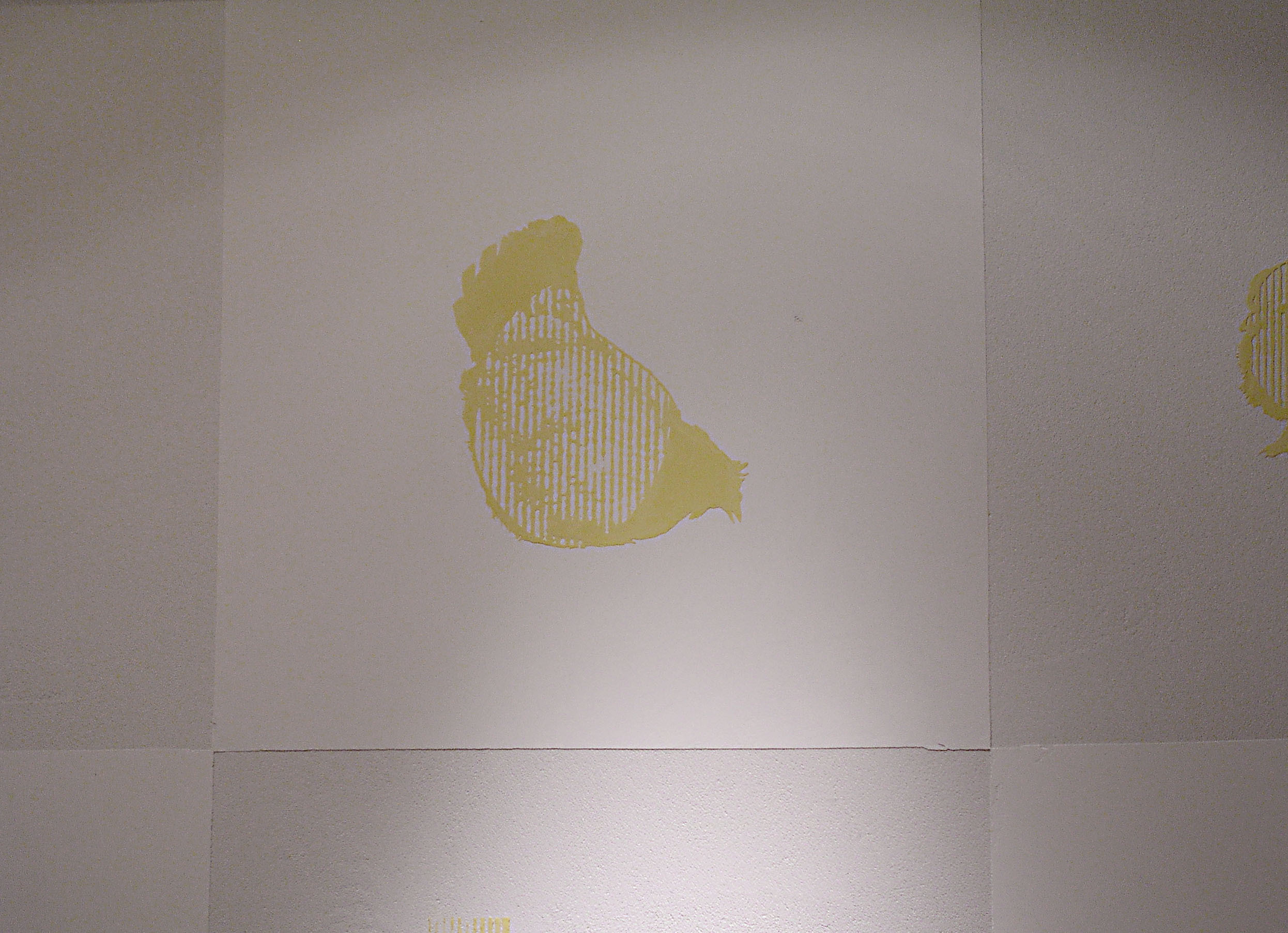 この施設で生活している人たちが生産活動を行っていて、自分たちの誇りでもある、椎茸、鶏、卵を2つづつ組み合わせ、杉の木とともに紋様化して、漆喰レリーフにしたもの。