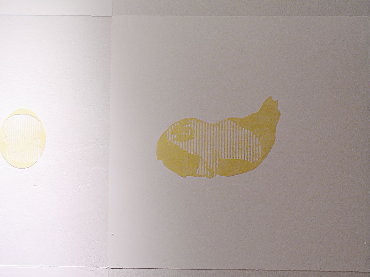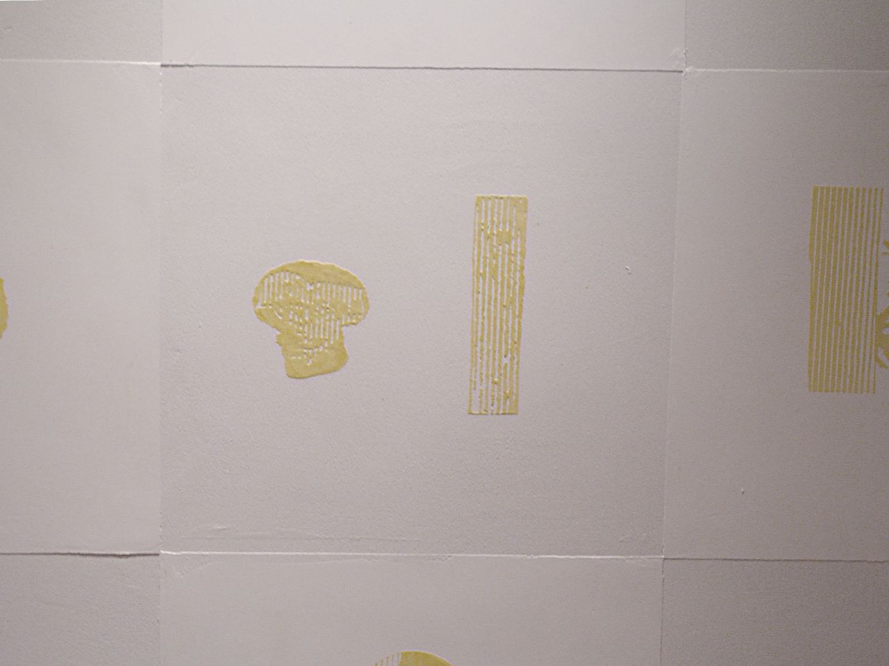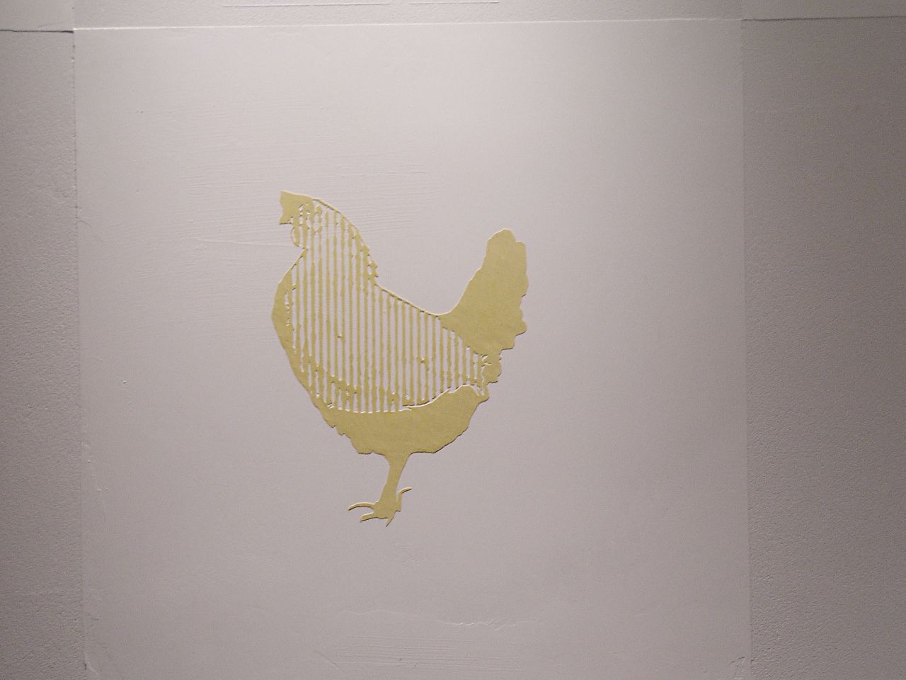 この施設で生活している人たちが生産活動を行っていて、自分たちの誇りでもある、椎茸、鶏、卵を2つづつ組み合わせ、杉の木とともに紋様化して、漆喰レリーフにしたもの。